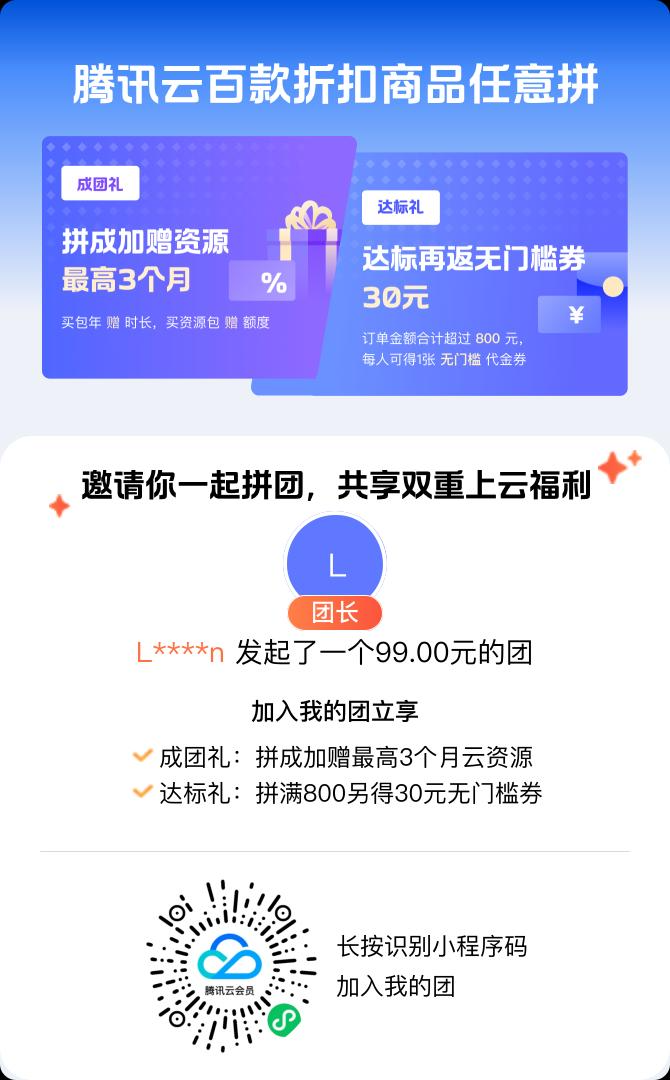 我在参加腾讯云双11拼团,拼成得产品加赠,拼满800另得无门槛券!点击前往:https://ads.qcloud.com/62fVyjYi
